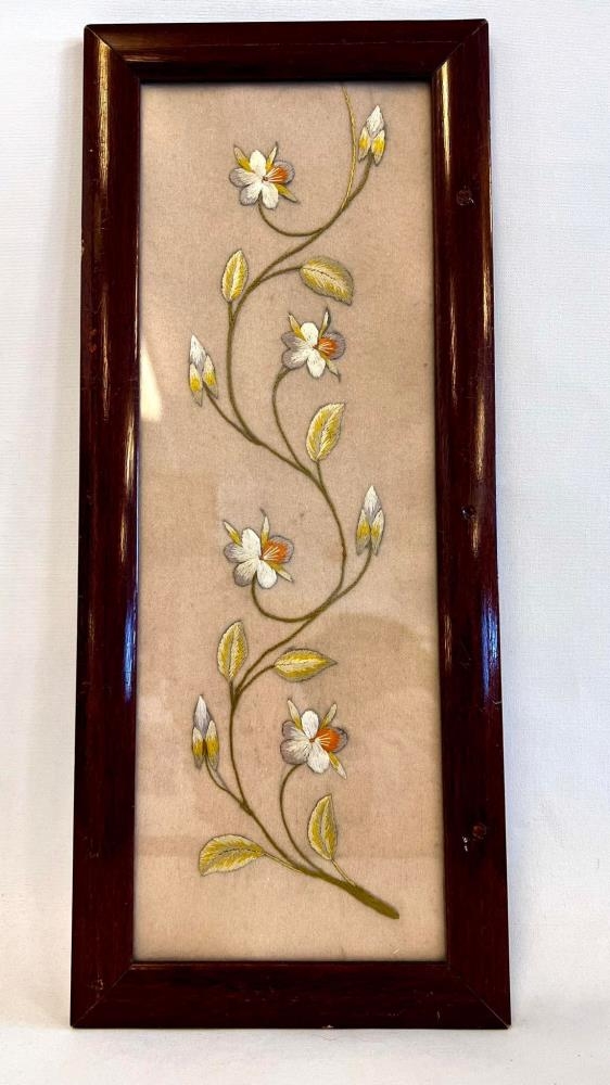 Mynd í viðar ramma, dökkmáluðum. Útsaumuð blómamynd á ljósbrúnum grunni. Hólmfríður Magnúsdóttir gerði myndina.