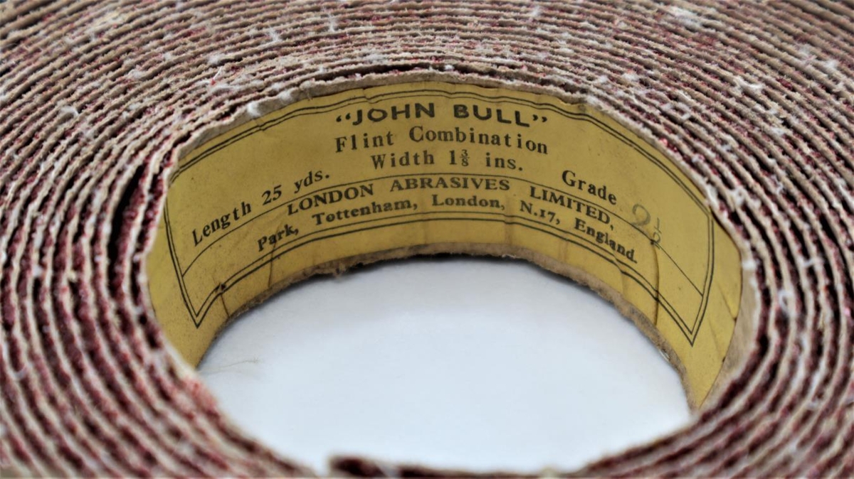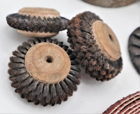 Ýmsir munir sem tengast slípivél sem notuð var við skógerð. Slípihjól, sandpappír, rúlla með mjög grófum slipipappír, burstahjól og fleira.