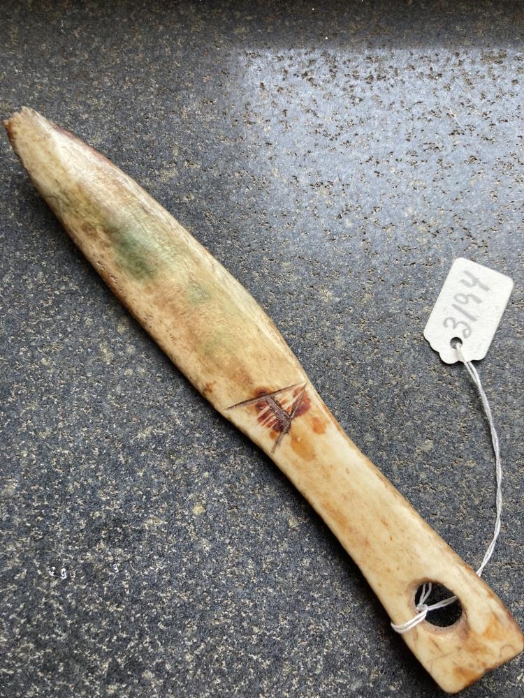 Litil byrðarnál úr beini (stórgrips-) merkt: A= Auðunn Einarsson á Helgusöndumþ