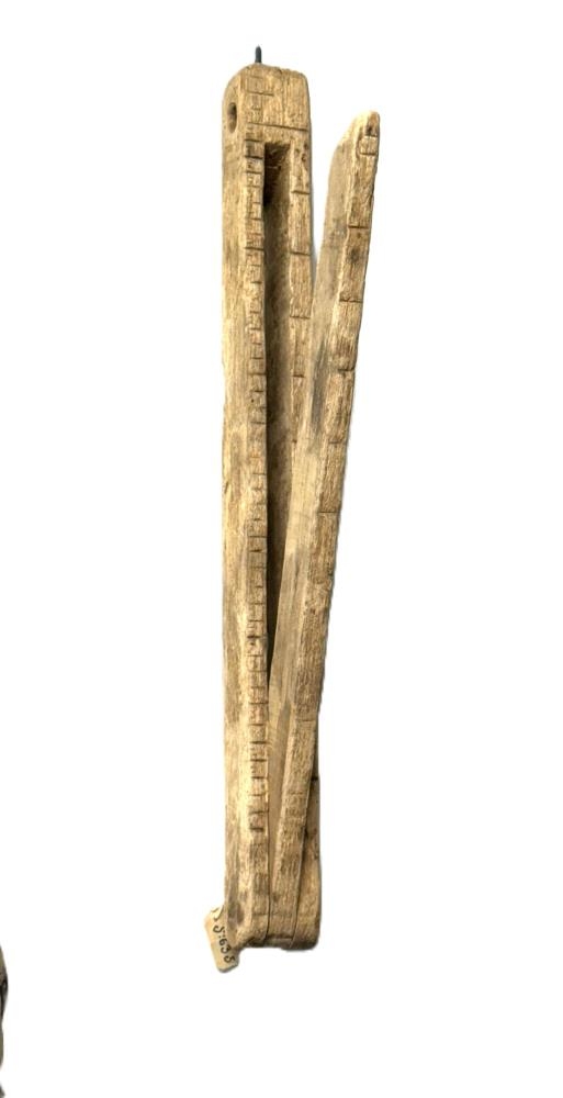 Sniðmát, smíðað úr eik. Er með alinmáli. Brennimerkt: GG = Gísli Gíslason. Gísli sá var faðir Árna Gíslasonar í Vík í Mýrdal, fór til Ameríku.