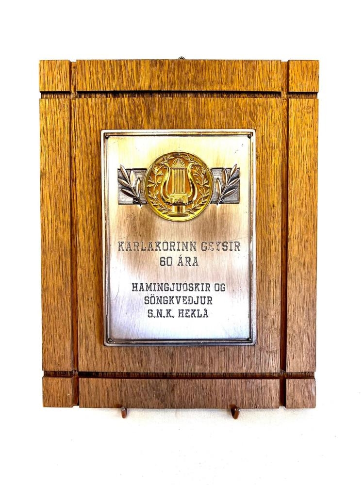 Ferkantaður viðarplatti með silfurplötu framan á. Mynd af hörpu í gullnum hring umkringd gróðri. Áletrun : Karlakórinn Geysir 60 ára. Hamingjuóskir og með söngkveðjum S.N.K. Hekla.