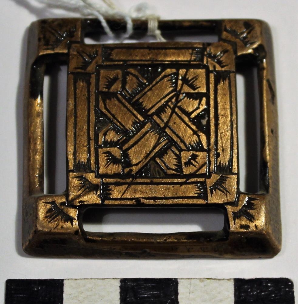 Höfuðleður af reiðbeisli. Á því eru tveir tíglar steyptir úr kopar, forkunnarvel gerðir.
