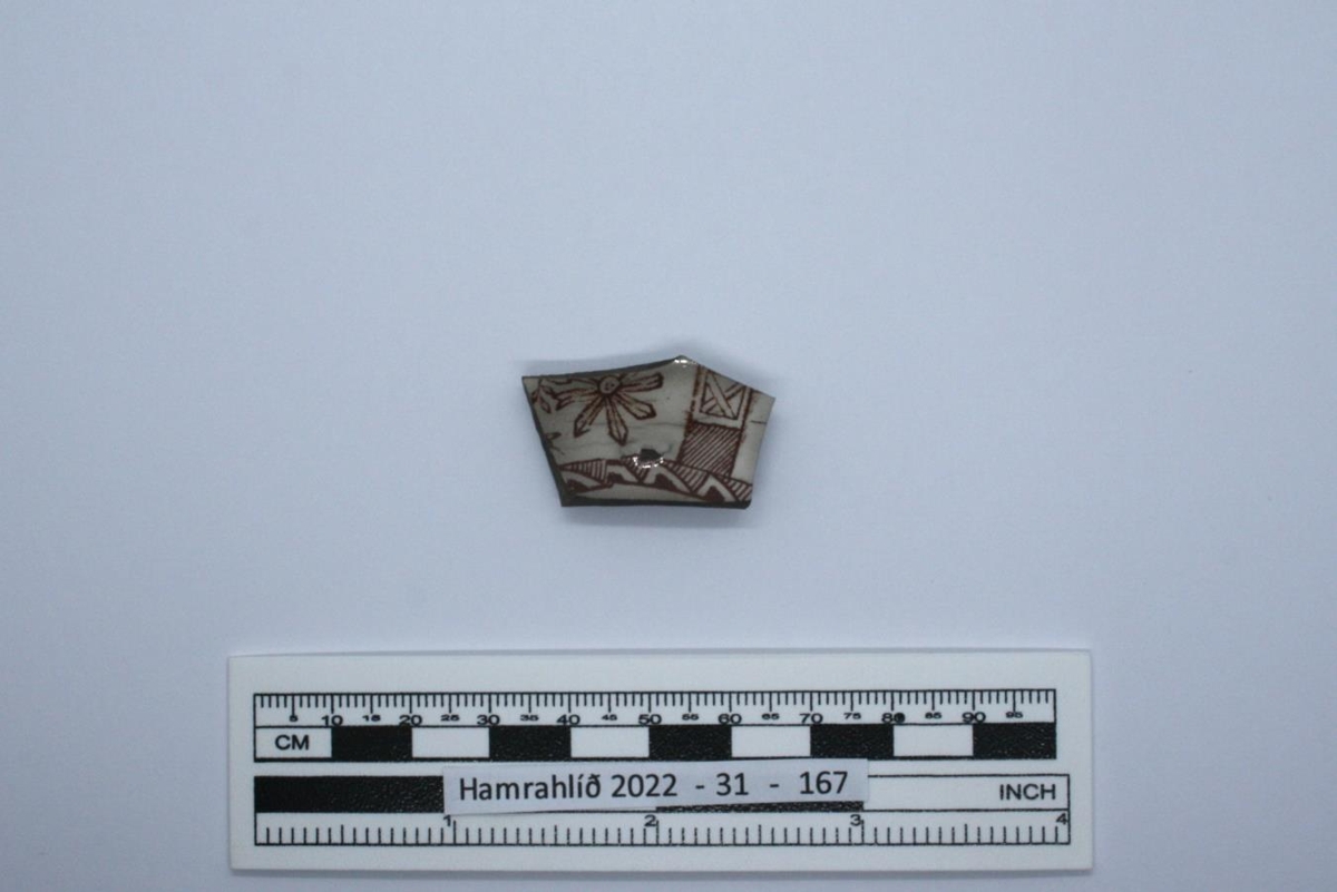 Botnbrot úr undirskál úr hvítleir. Innanvert brotið er skreytt brúnu blómamynstri, samskonar og það er skreytir bolla 2022-31-146. Líklega undirskál úr sama stelli. Líklega brot úr sömu undirskál og 2022-31-173.