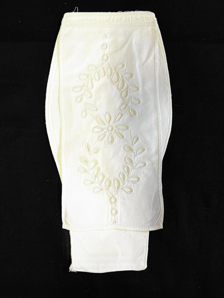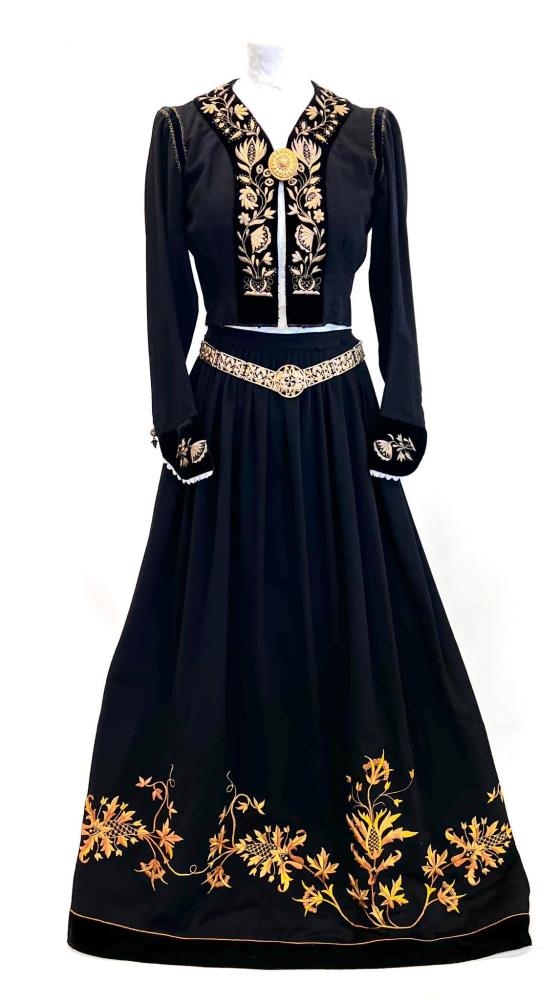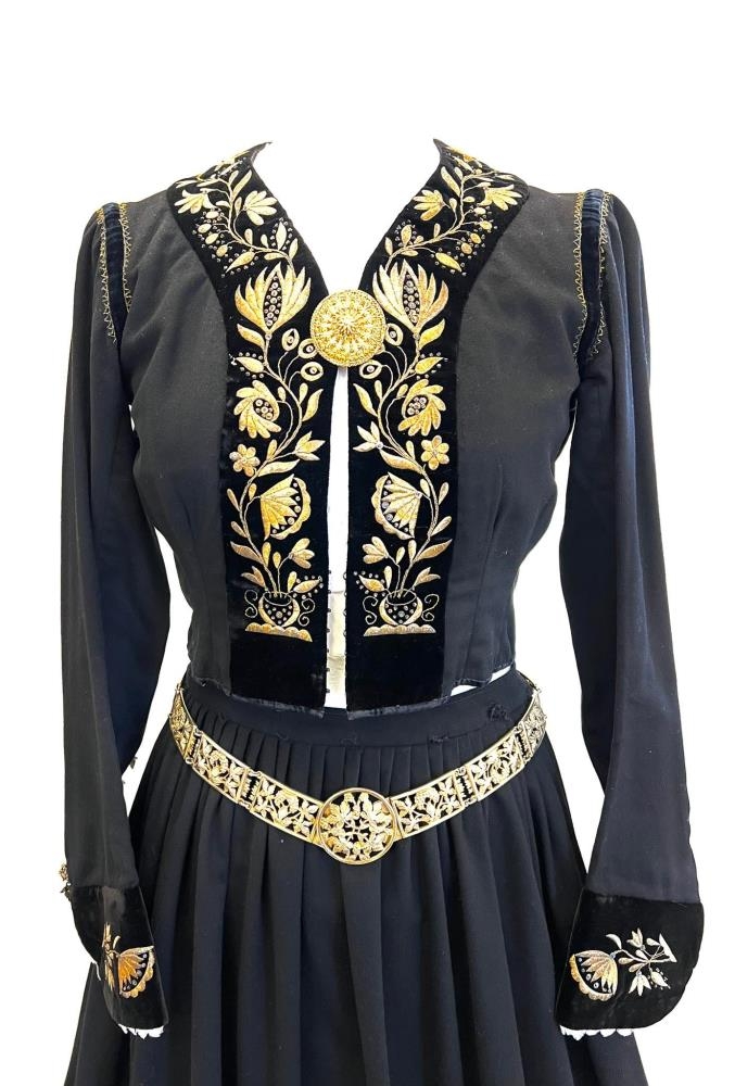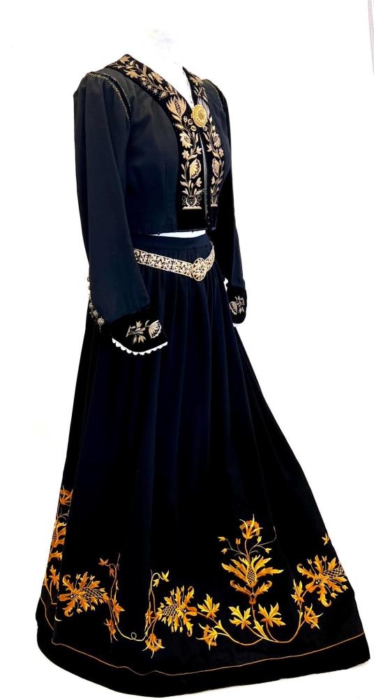 Fyrsti eigandi búningsins var frú Þuríður Jakobsdóttir, f. 14.5.1865, eiginkona Sigurðar Kvaran, læknis í Höfðahverfi á árunum 1893-1904, en þá mun þessi búningur hafa verið saumaður. Hjördís dóttir þeirra seldi Steinunni Karólínu Ingimundardóttur, f. 29.4.1925, búninginn milli 1965-1970. Talið er að Valgerður Karólína Guðmundsdóttir, prestfrú í Grenivík, amma Steinunnar, hafi meðal annarra saumað hluta af blómabekknum sem er skatteraður. Valgerður Karólína Guðmundsdóttir lét gera beltið. Árni Höskuldsson gullsmiður í Reykjavík smíðaði hlekki til viðbótar þeim sem til voru til að fullgera beltið fyrir Steinunni Karólínu. Koffur, brjóstnæla og ermahnappar fylgdu búningnum þegar Steinunn keypti hann.