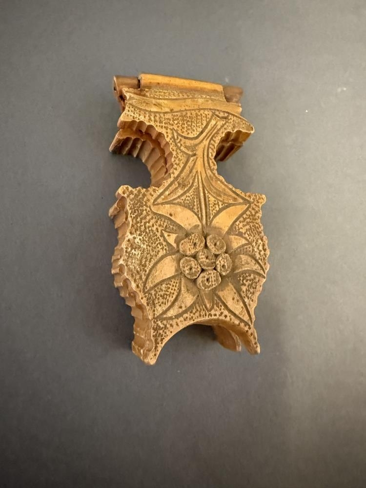 Úrabakki úr tré, með útskornu loki. Gerður fyrir kvenúr. Vafalaust útlendur. Var í eigu Elina Marie Bolette konu Hallgríms Sveinssonar biskups.