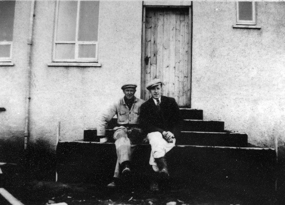 Kristinn Jónsson og Guðjón Hjörleifsson múrarameistari á tröppum bakhliðar Sjúkrahússins í Keflavík sem þá var í byggingu