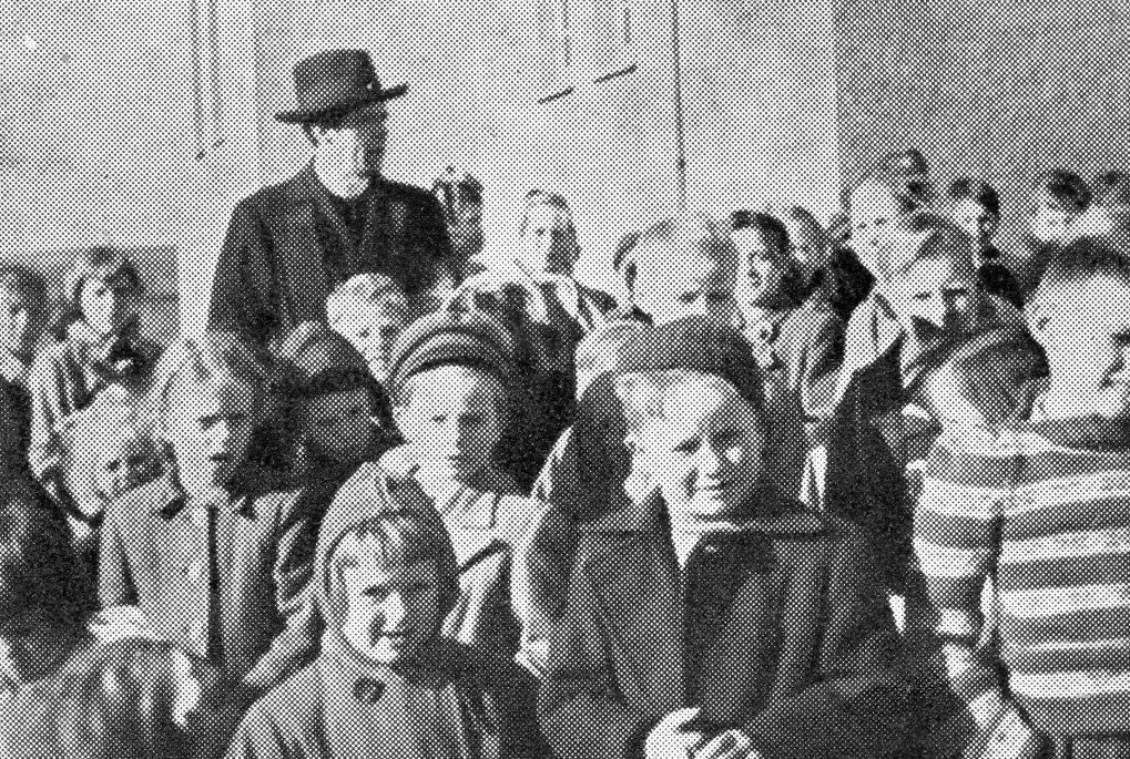 Sr. Eiríkur Brynjólfsson með barnahóp sunnan Keflavikurkirkju um 1940 (Úrklippa úr blaði).