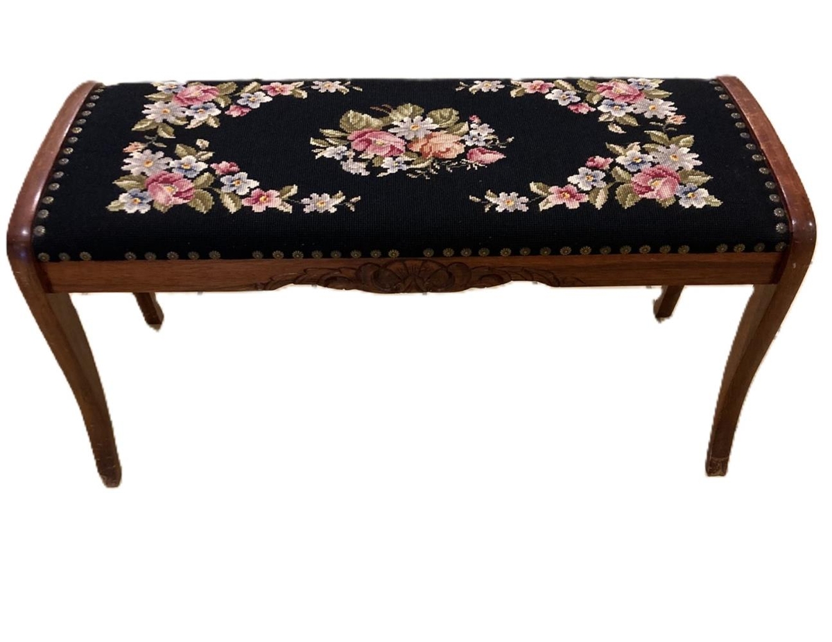 Útsaumaður setbekkur. Útsaumurinn er verk Árnýjar Ingibjargar Filippusdóttur Skólastjóra og bekkurinn er úr búi hennar.