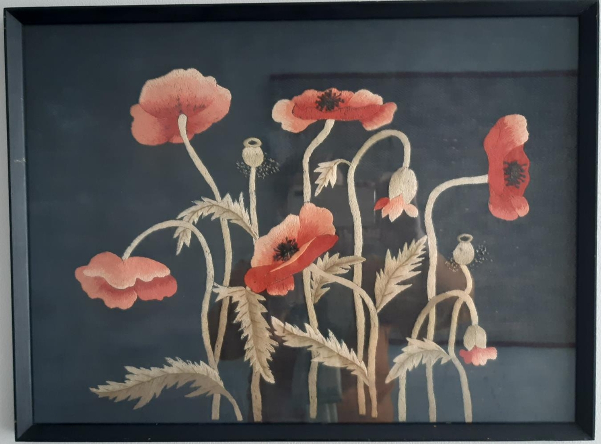 Mynd. Bleikrauð blóm með fölgrænum leggjum, kúnstbróderuð í svartan silkidúk. Aftan á myndinni stendur: Unnur Pétursdóttir (1894-1968) frá Bollastöðum. Í Kaupmannahöfn 1917.
