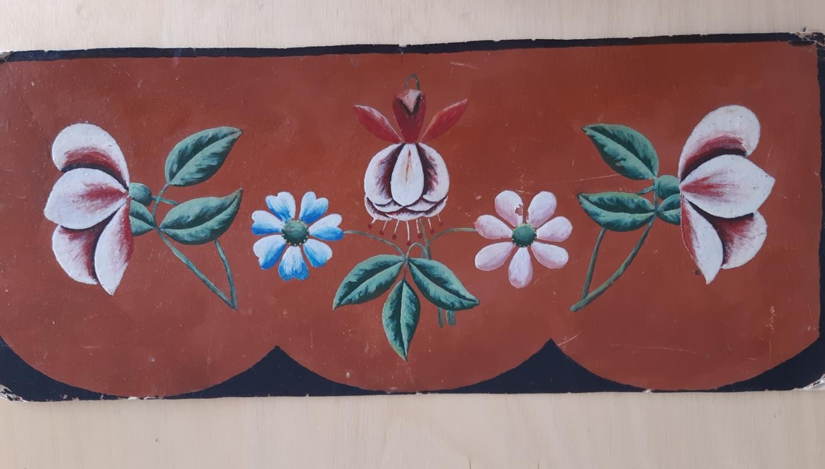 Saga: Margrét Þorkelsdóttir (1893-1937) frá Barkarstöðum í Svartárdal málaði spjaldið, á árunum 1929-1932, að talið er.