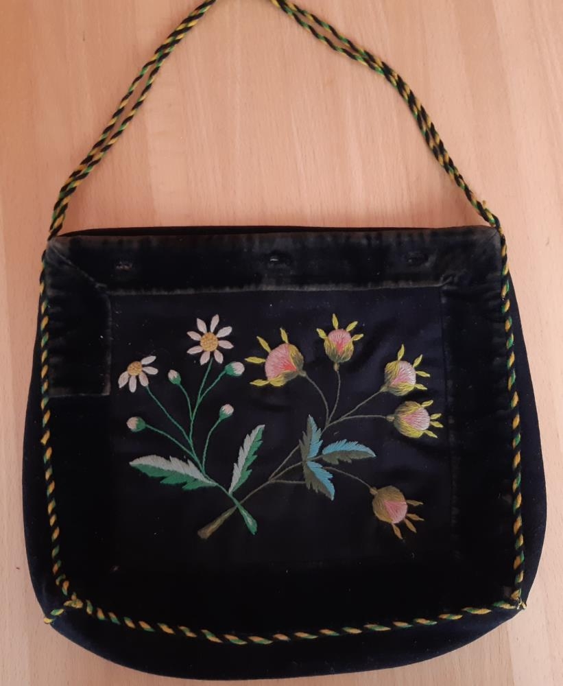 Veskið er saumað úr svörtu flaueli, framan á því eru ísaumuð blóm. Veskið er fóðrað með brúnu bómullarefni. Svart, grænt og gult band undið saman í snúru myndar hald en einnig er snúran lögð niður með hliðum og í kringum botninn á veskinu.