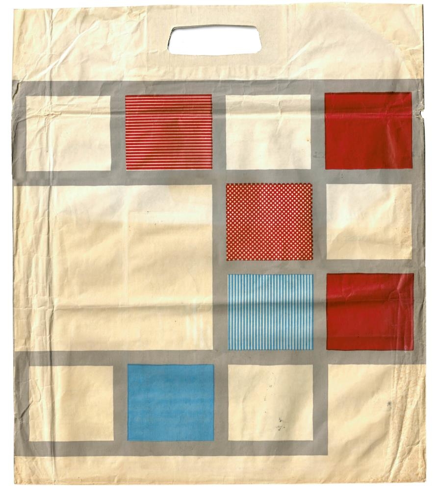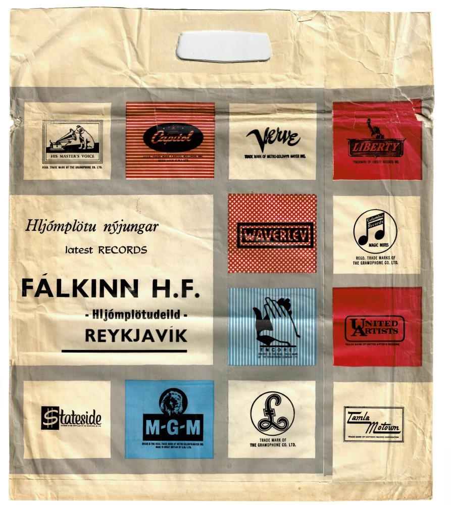 Bréfpoki, krem hvítur í grunninn. Lógó margra hljómplötuútgefanda á pokanum.