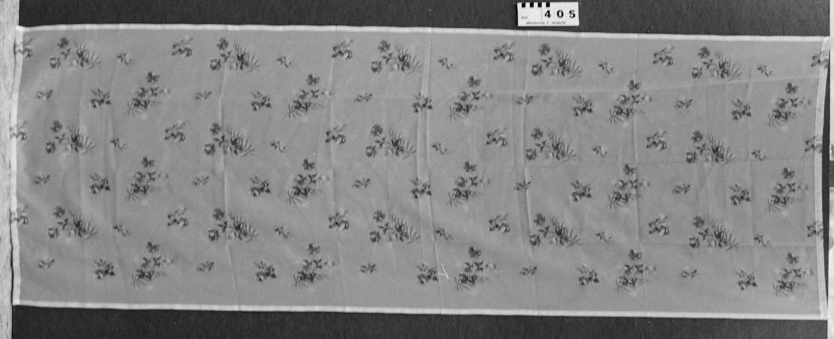 úr þunnu, hálfgegnsæu efni hvítu að lit með blómamynstri.