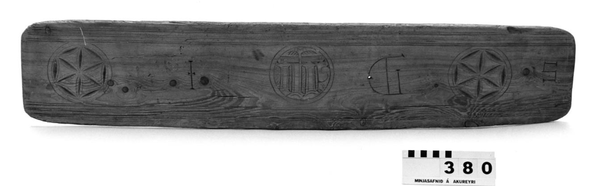 rúmfjalarinnar eru hefluð strik langseftir út við brúnir. Á miðju