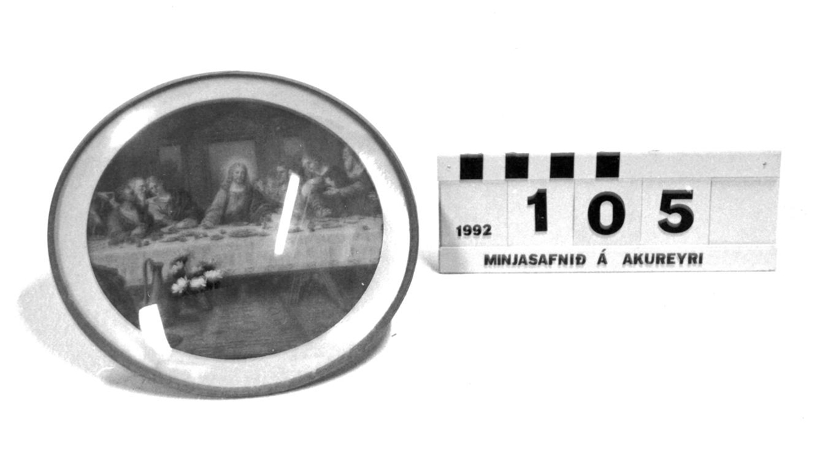 Teiknuð lituð mynd af síðustu kvöldmáltíðinni. Myndin er hringlótt og sett á hana kúpt hringlótt gler sem er fest við með breiðu brúnu límbandi. Bak er úr pappa og þar er smeigt festingu til að hengja myndina upp.