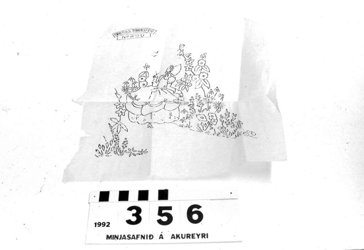 er saumað eftir. Mótífið er kona með körfu í hægri hendi og