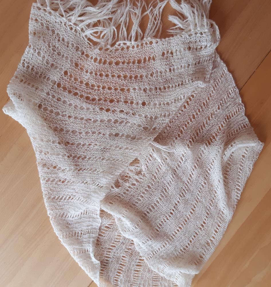 Hvítt herðasjal, unnið úr fínu þelbandi. Garðaprjón og fellt úr á milli. Dálítið slitið til endanna, einkum öðrum megin. Lengd 135 cm, kögrið er 8 cm.
