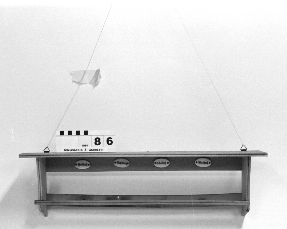 með snögum og slá fyrir handklæði. Fyrir ofan snagana eru skyldir