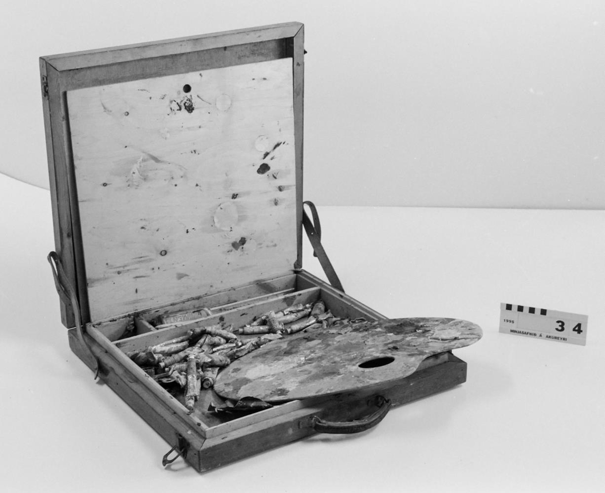 nokkur hólf sem í eru penslar, glas undir terpentínu, tommustokkur og allmargar