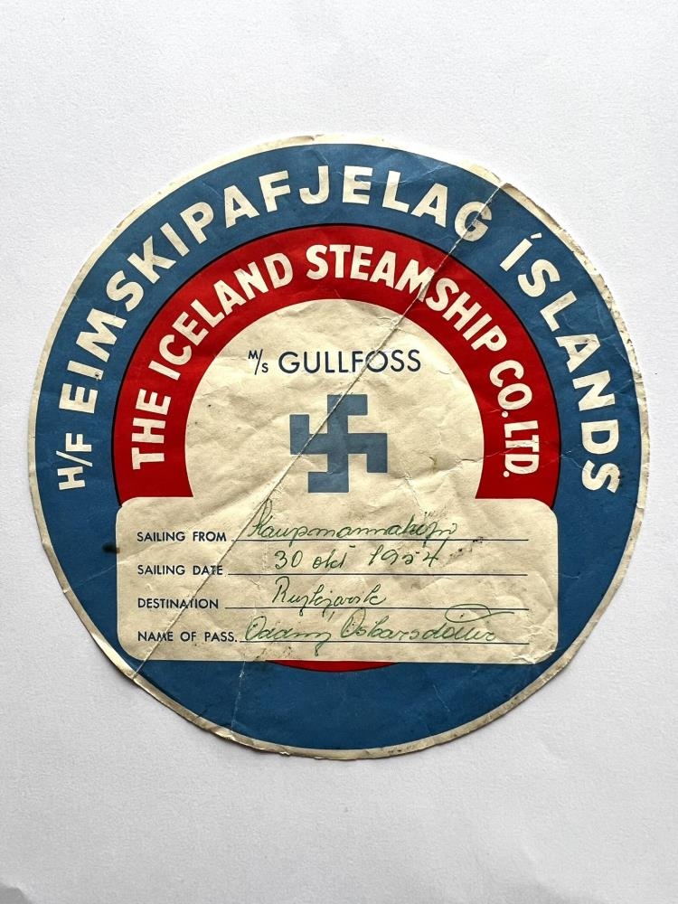 Stór hringlaga miði með lím afgöngum aftaná. Líklega til að merkja farangur. Miðinn er með merki Eimskipafélags Íslands og prentað :