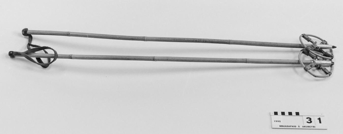 með leðurólum á endum, broddur stafanna er festur með álhólki, járnoddur