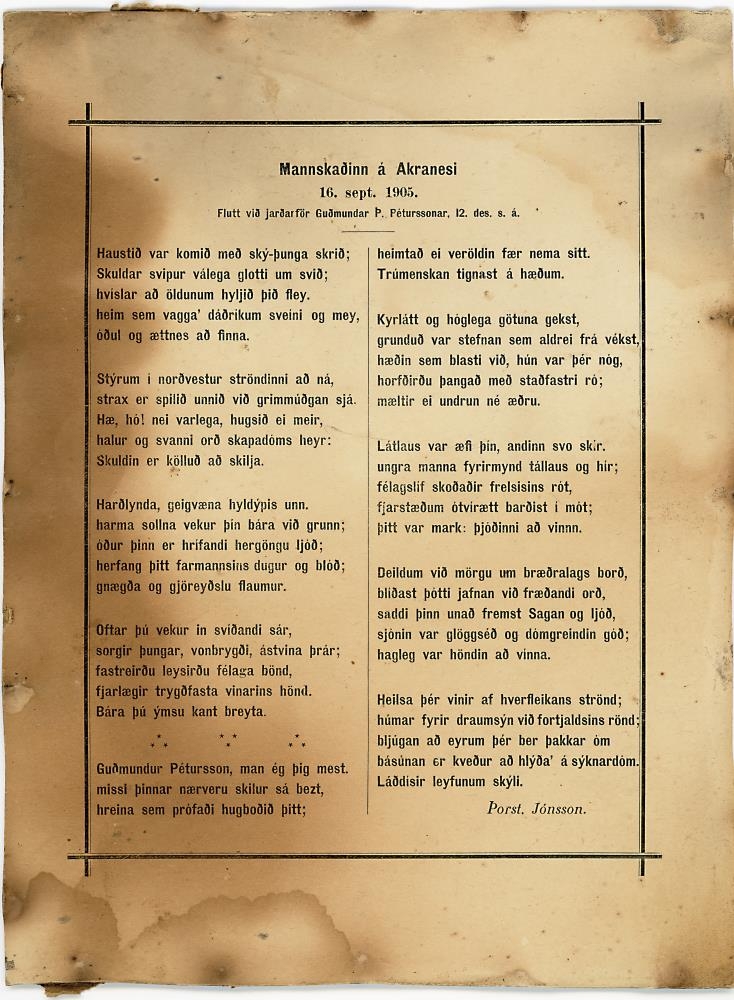 Grafskrift: Guðmundur Þorgrímur Pétursson (30.12.1867 - 16.09.1905) frá Grúnd á Akranesi