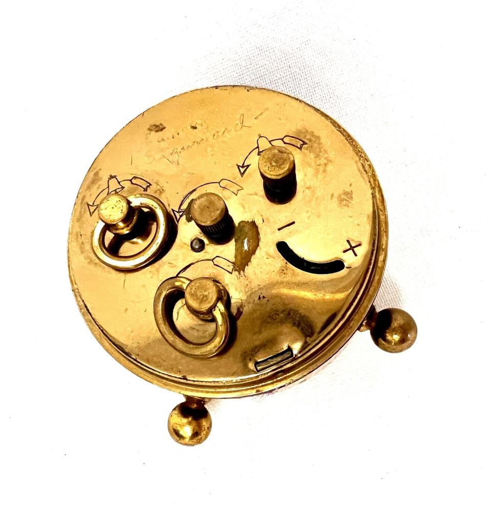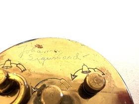 Lítil rauðbrún vekjaraklukka. Tveir fætur undir henni að framan en hallar aftur. Aftan á hana er grafið, Jóhanna Sigurðardóttir.