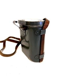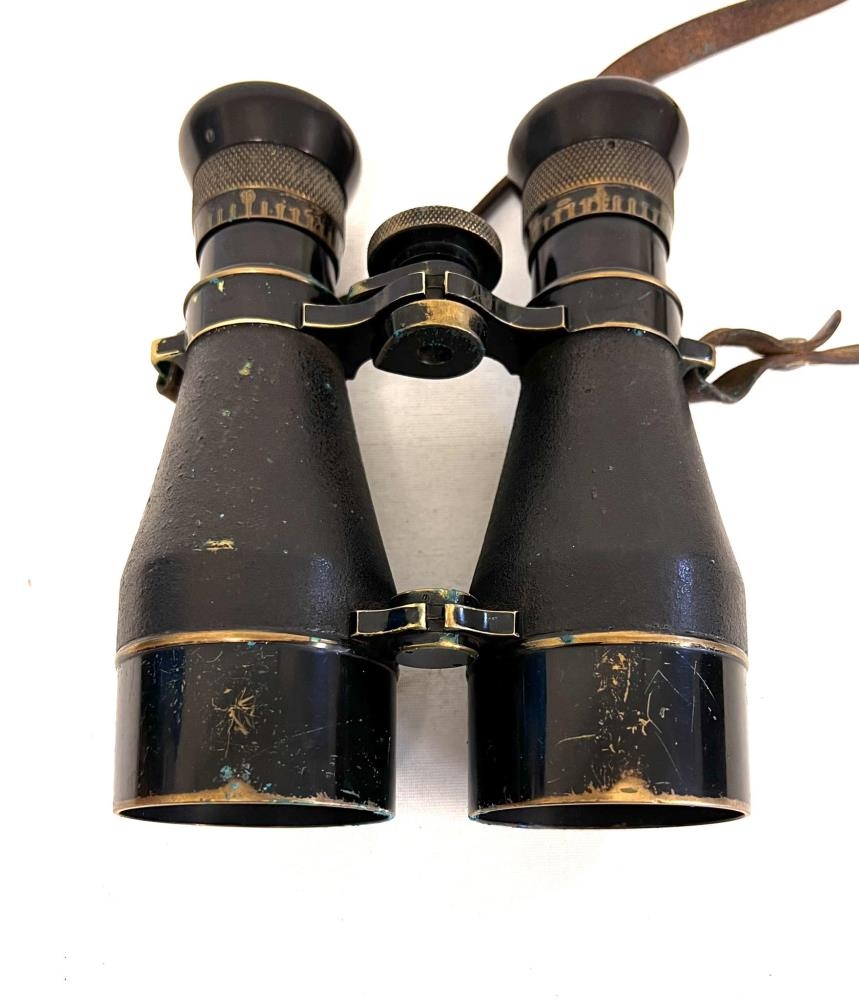 Svartur sjónauki, tvöfaldur. Með leðuról. Í dökkgráu málmhulstri, einnig með leðuról.