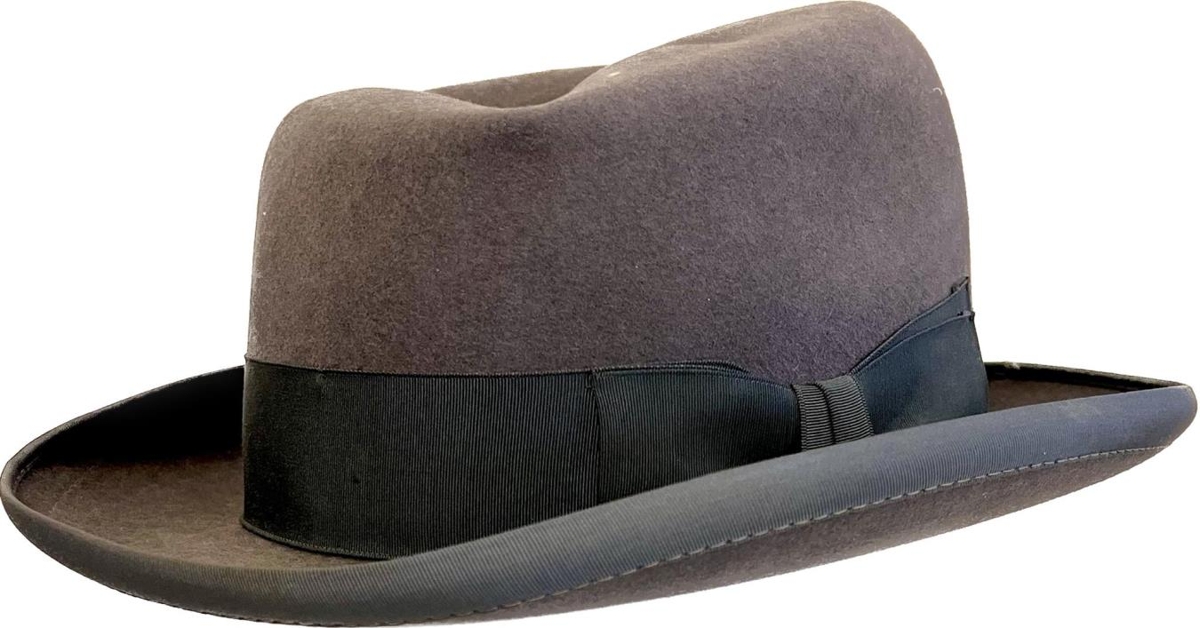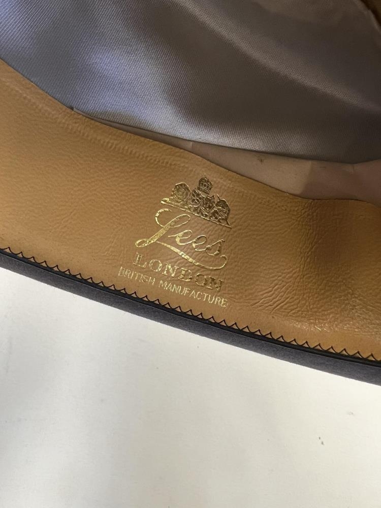 Karlmannshattur, dökkgrár með svörtu bandi. Ljóst leður innan í hattinum. Handskrifað innan í hattinn V.S. - Merkt : Lees, London, British Manifacture. Herradeild J.M.J. Akureyri.