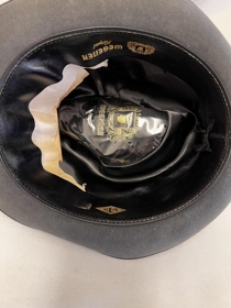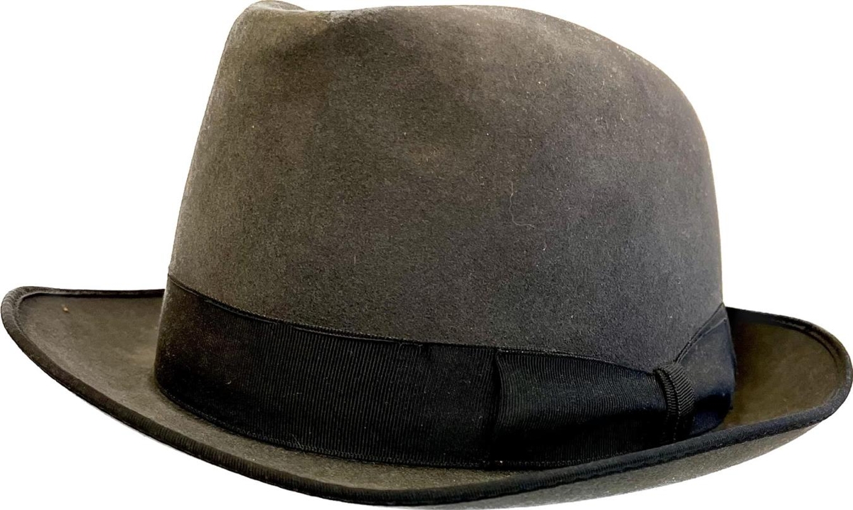Dökk grár karlmannshattur með svörtum borða. Merktur að innan KEA, saumaður af Wegener : Royal