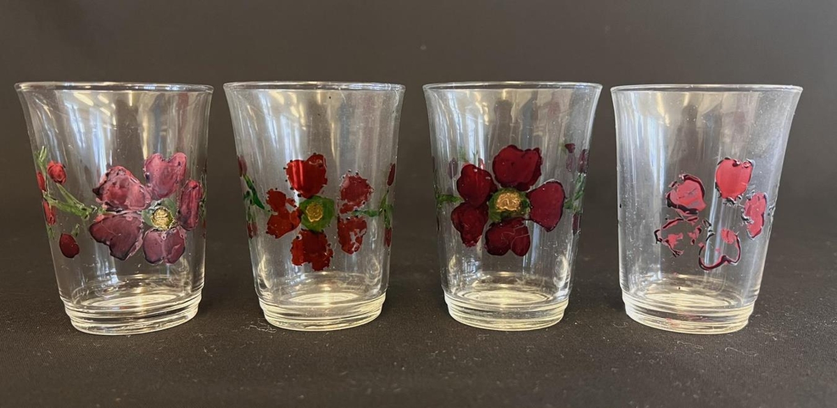 4 glær glerstaup með handmáluðum blómum. Sum farin að flagna af. Rauð-bleikir litir.