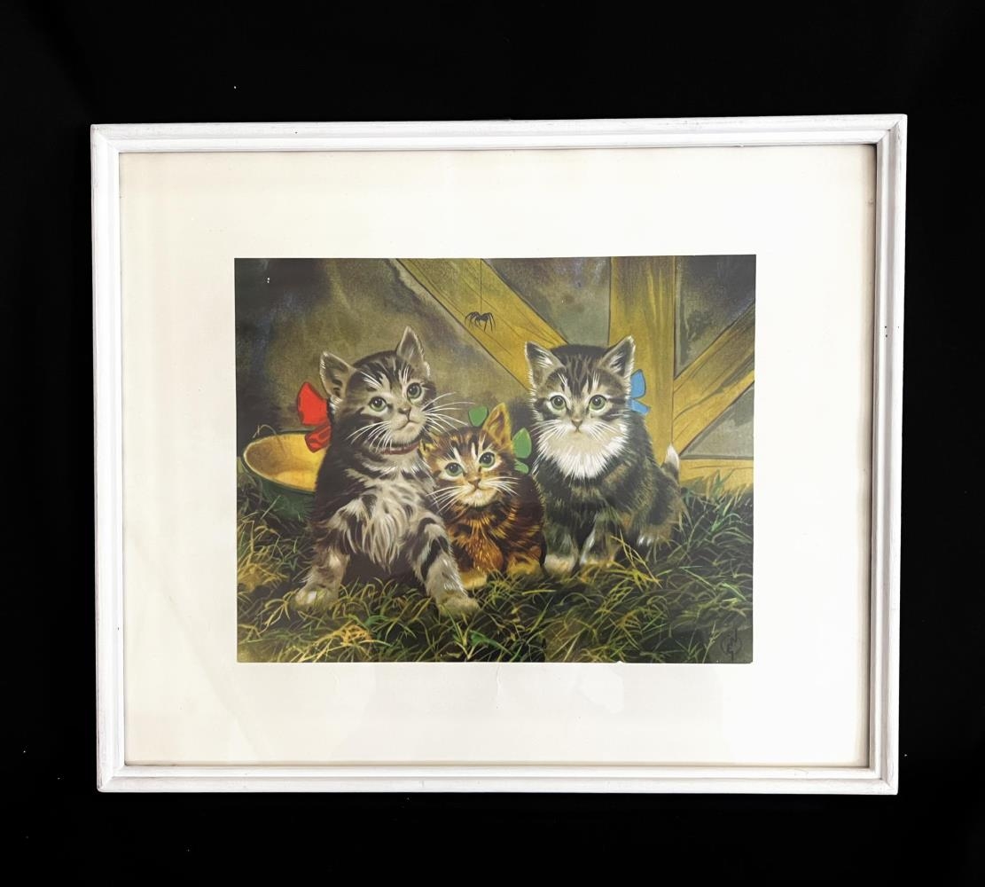 Veggmynd, skrautmynd. Hvítur rammi og prentuð mynd. Myndefni er 3 kettlingar (í hlöðu?) sem horfa upp á könguló.