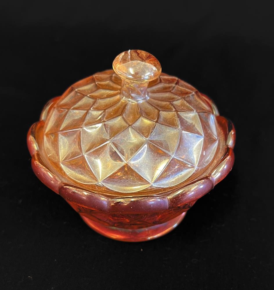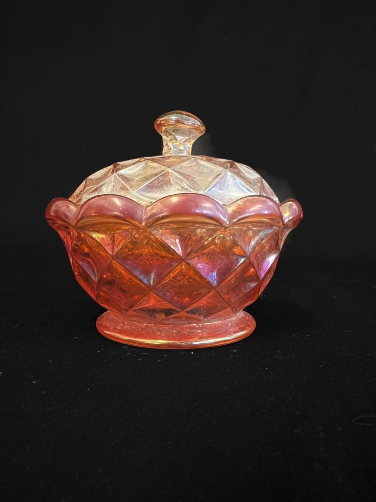 Lítil rauðbleik krús úr gleri með loki.