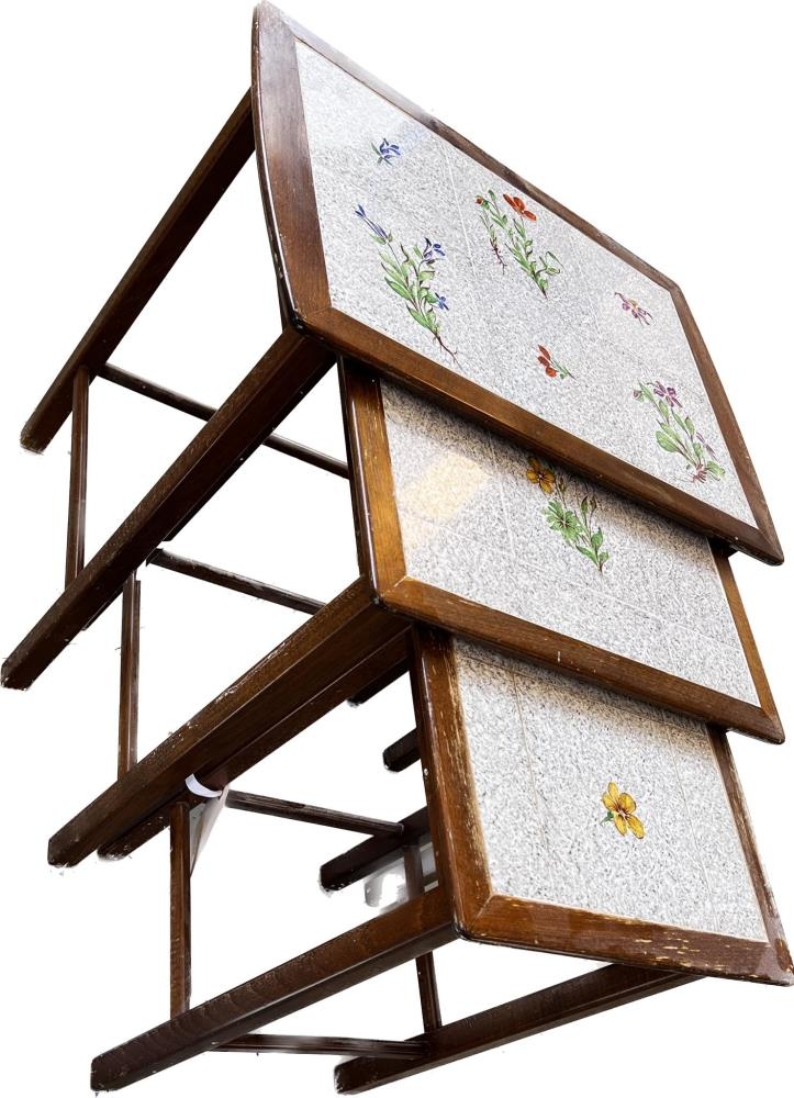 Innskotsborð. 3 borð sem stingast hvert undir annað. Myndskreytt með blómum. Stærsta borðið er 53x37x51. Miðstærðin er 41x30x48 og minnsta borðið er 30x25x46 cm. Glerplata er yfir stærsta borðinu.