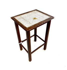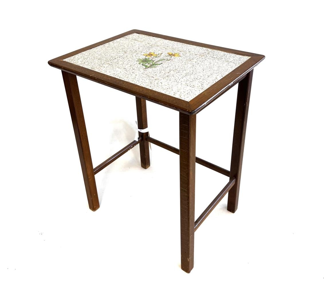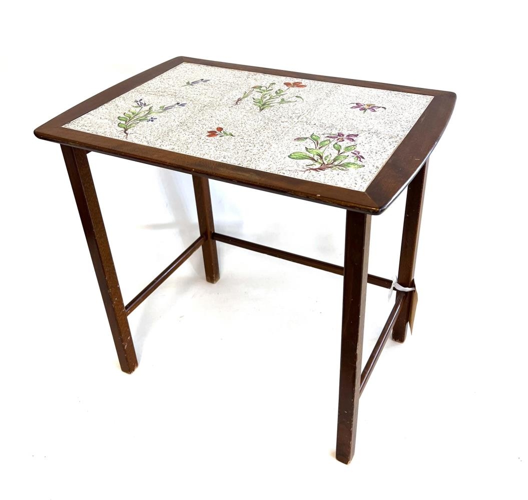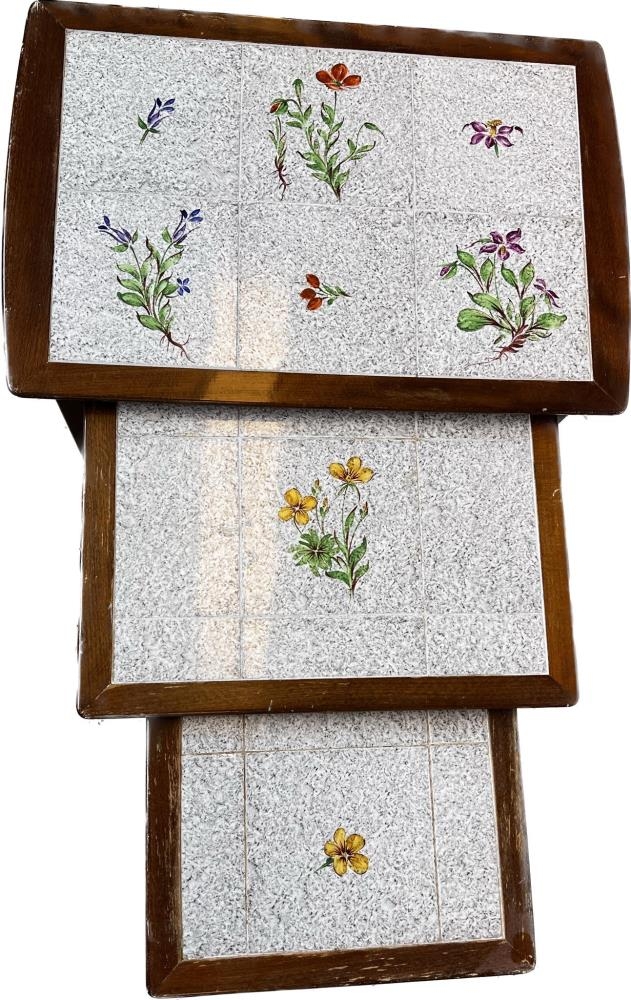 Innskotsborð. 3 borð sem stingast hvert undir annað. Myndskreytt með blómum. Stærsta borðið er 53x37x51. Miðstærðin er 41x30x48 og minnsta borðið er 30x25x46 cm. Glerplata er yfir stærsta borðinu.