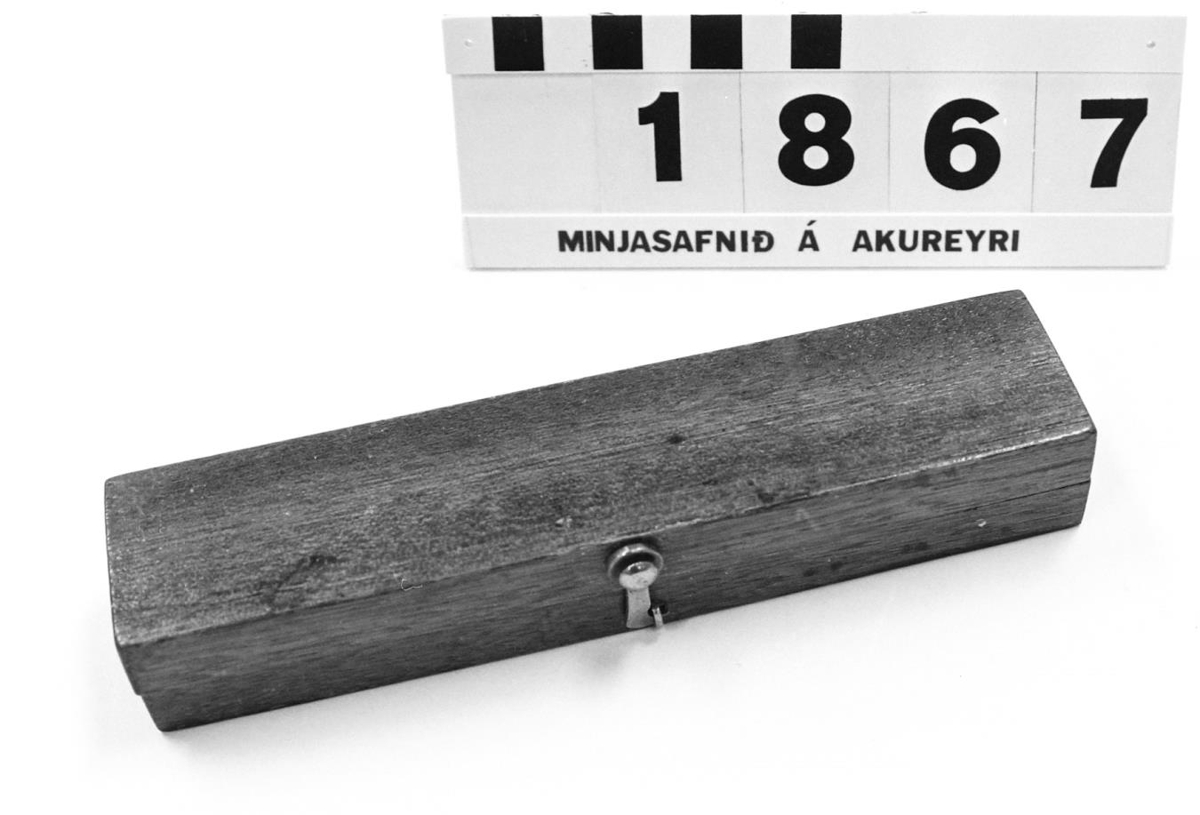 17 x 4 x 1,3 sm, eru hjaraðar saman með messinghjörum og lokaðar með messingkrók.