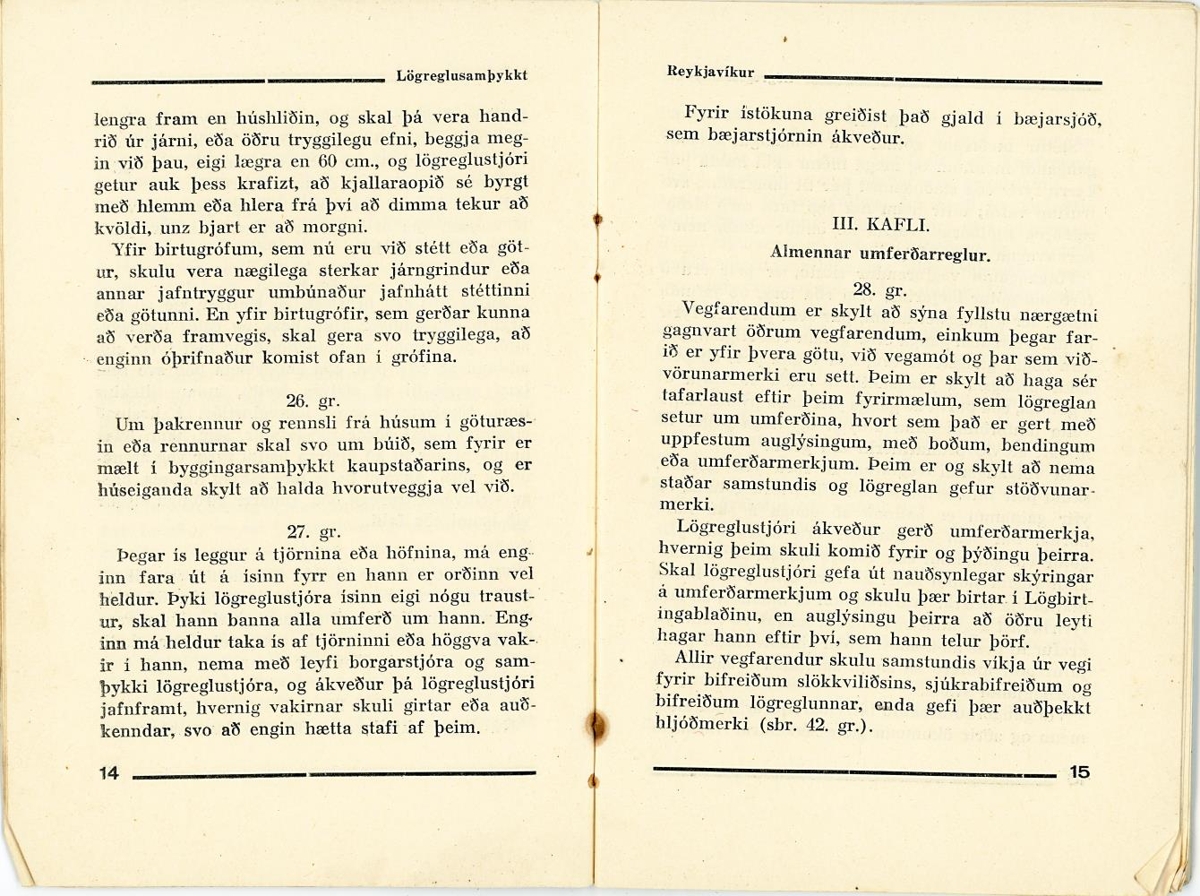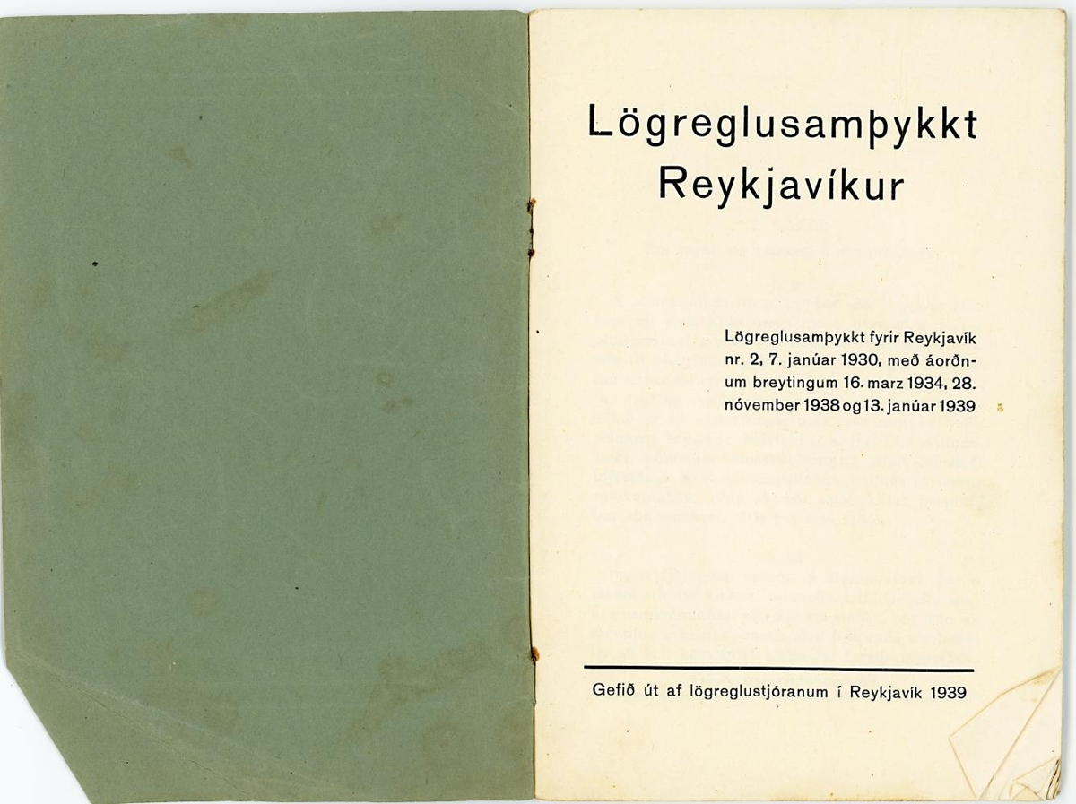 Lögreglusamþykkt Reykjavíkur : lögreglusamþykkt fyrir Reykjavík nr. 2, 7. janúar 1930, með áorðnum breytingum 16. marz 1934, 28. nóvember 1938 og 13. janúar 1939. / Reykjavíkurborg. - 46 bls.
