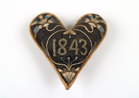 Hjartalaga nálapúði, útsaumaður á báðum hliðum og bryddur við barma með ljósu flaueli. Á annarri hliðinni er púðinn klæddur grænleitu efni og útsaumaður blómaskreytingum og upphafsstöfum: K.Þ.D. Það er fangamark Katrínar Þórðardóttur (f. 1806, d. 1899) sem átti nálapúðann. Á hinni hliðinni er hann klæddur dökku flaueli, sem nú er orðið snjáð. Í þá hlið eru baldýruð blóm, marglituð, og ísaumað ártalið 1843. Púðinn er orðinn nokkuð upplitaður en annars er þetta góður og vel gerður gripur, í nokkuð góðu ástandi.
