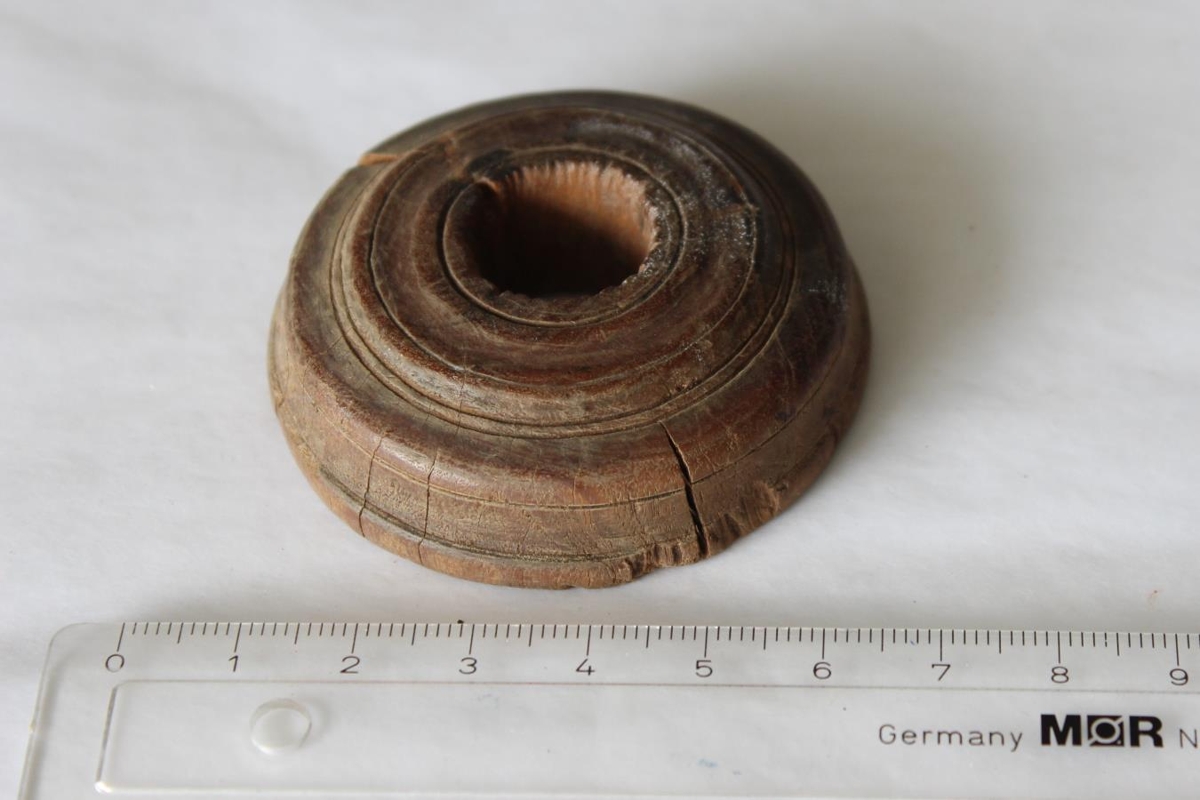 Gamall, renndur snældusnúður frá Sandhólaferju, úr dökkum, hörðum viði, þverm. 5,5 sm, auga 1,5 sm. Hefur verið notaður sem árenningur, um það vitna skorur í auganu.