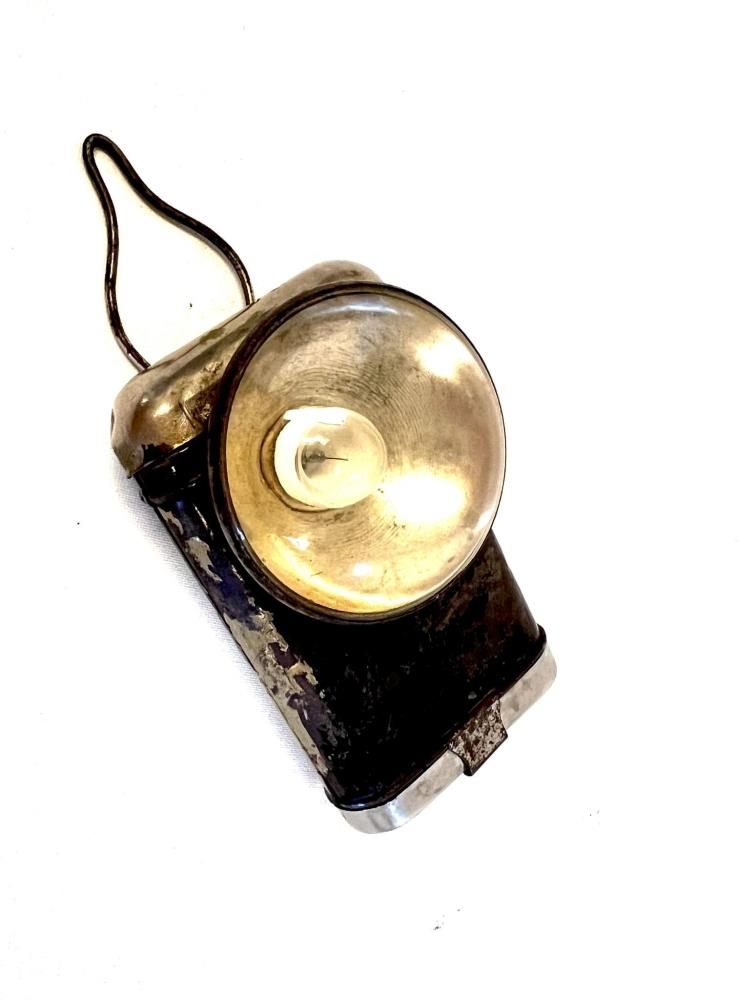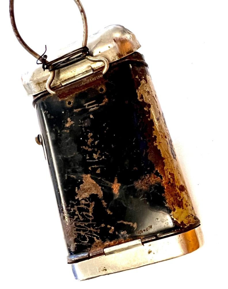 Vasaljós, málmhylki og ljós framan á kassanum. Hanki til að hengja það upp. Aftan á er búið að rista óljóst í málminn, Marz