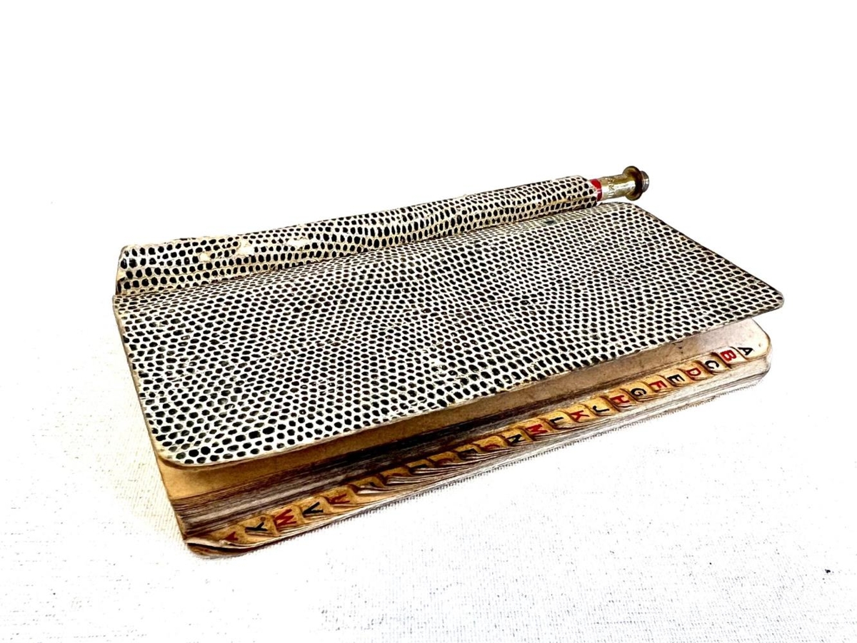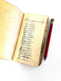 Lítil ljósgrá minnisbók með hólfi fyrir blýant á kilinum. Blýanturinn er rauður með gylltum hnúð á endanum. Minnisbókinni er skipt upp eftir stafrófsröð, en í bókina er uppskrifaður listi yfir mannanöfn, kvenmans- og karlmannsnöfn.