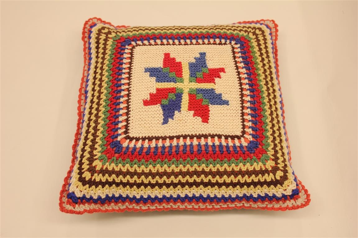 Púðaborðið er þannig að í miðjunni er prjónaður ferhyrningur en breiður kantur er heklaður í kring um ferhyrninginn. Munstur í ferhyrnda bútnum er áttablaðarós. Margir litir eru í prjóni og hekli. Í bakhlið púðans er svart hörefni.