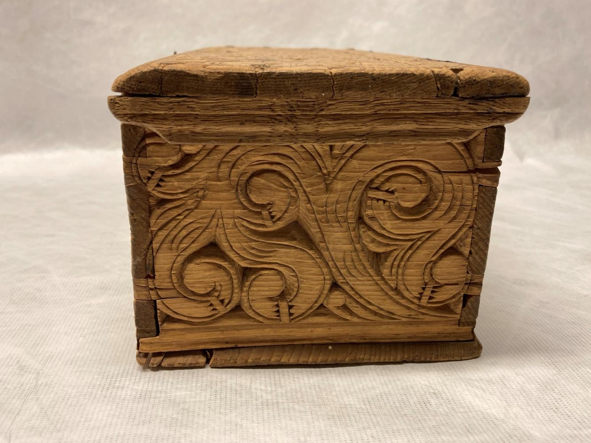 Útskorinn stokkur með fangamarki og ártali; 1825. Úr eigu Matthildar Guðmundsdóttir (f. 1847) ljósmóður á Dyrhólum í Mýrdal. Ofan í stokknum eru þvottaklemmur úr hornum og við merkt E.B.