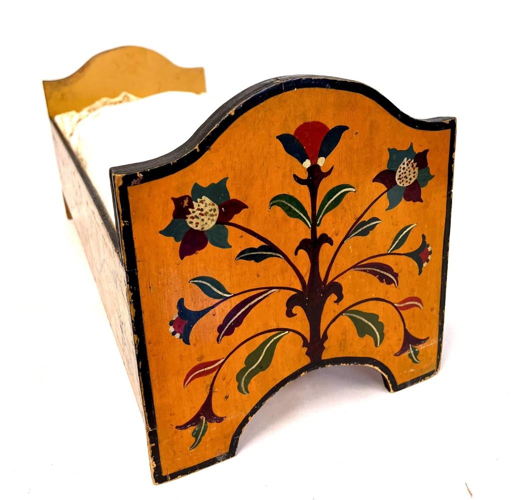 Dúkkurúm með sængurfötum. Blúndur á sængurfötum, koddi, sæng og undirdýna. Rúmið er viðarlitað en lakkað og með rauðu og grænu blóma- og laufmunstri máluðu á rúmið. Smíðað af Jóni Arasyni Jónssyni, fæddur á Grýtu.