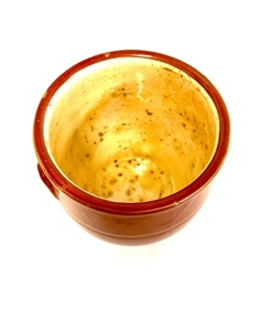 Krukka, leirkrukka brún að utan og ljósari að innan. Glerungur. Lítil eyru eins og höld en þó ekki með gati.