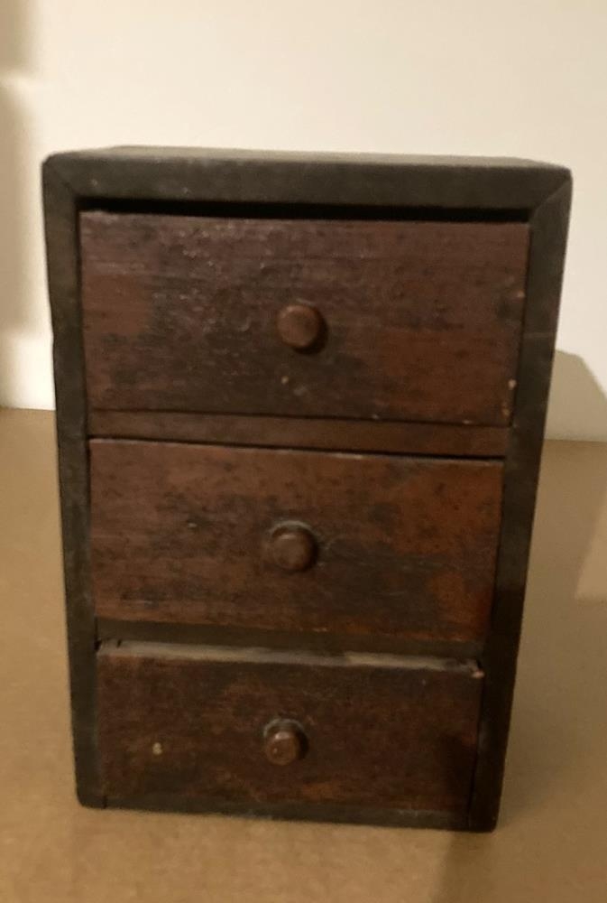 Kommóða, örsmá, smíðuð að mestu úr mahogní af langafa gefanda, Jóni Þórðarsyni í Skammadal, um 1840. Frá Einari H. Einarssyni, Skammadalshóli.