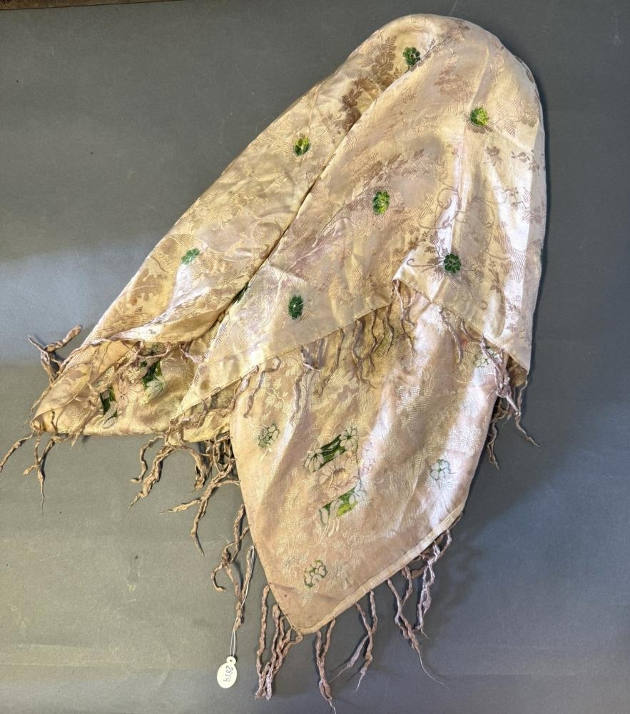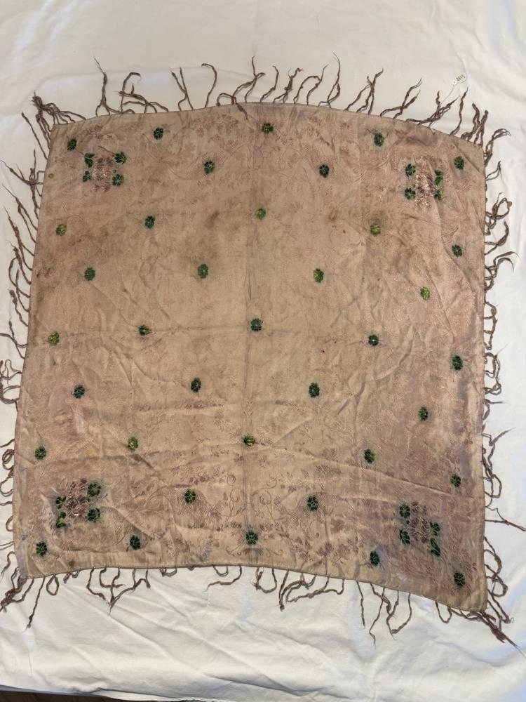 Silkiklútur frá um 1840-50. Var í eigu Vilborgar Tómasdóttur. Fölbleikur með grænu og gulu blómamynstri.