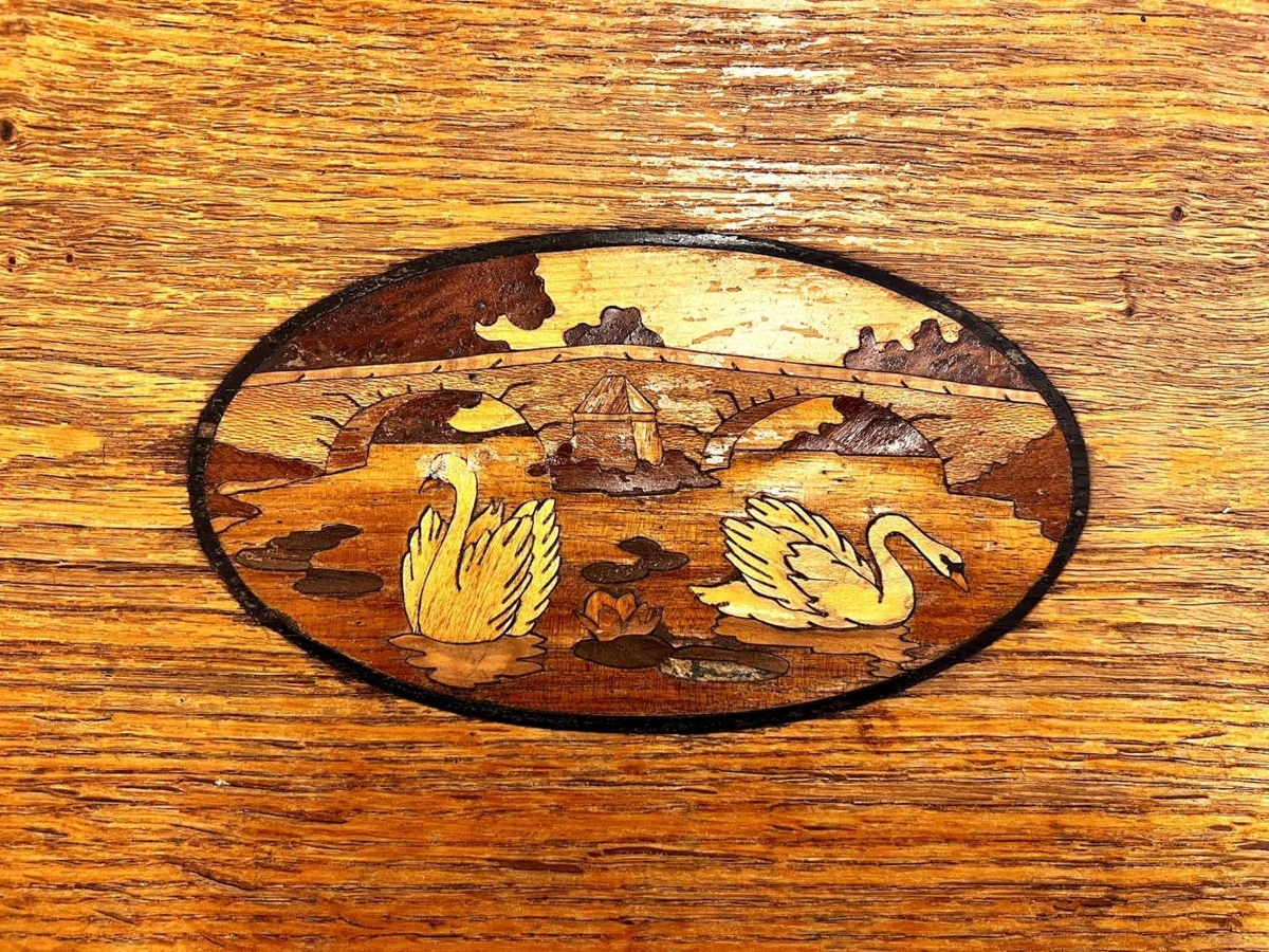Á borðplötu er myndskreyting af tveimur svönum á tjörn, brú og garður í bakgrunn. Stólarnir eru með rauðu flauelsáklæði. Borðið er 64x46x53 cm og stólarnir eru 28x24x63 cm