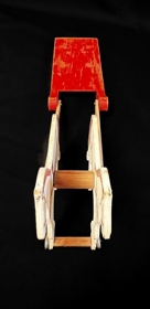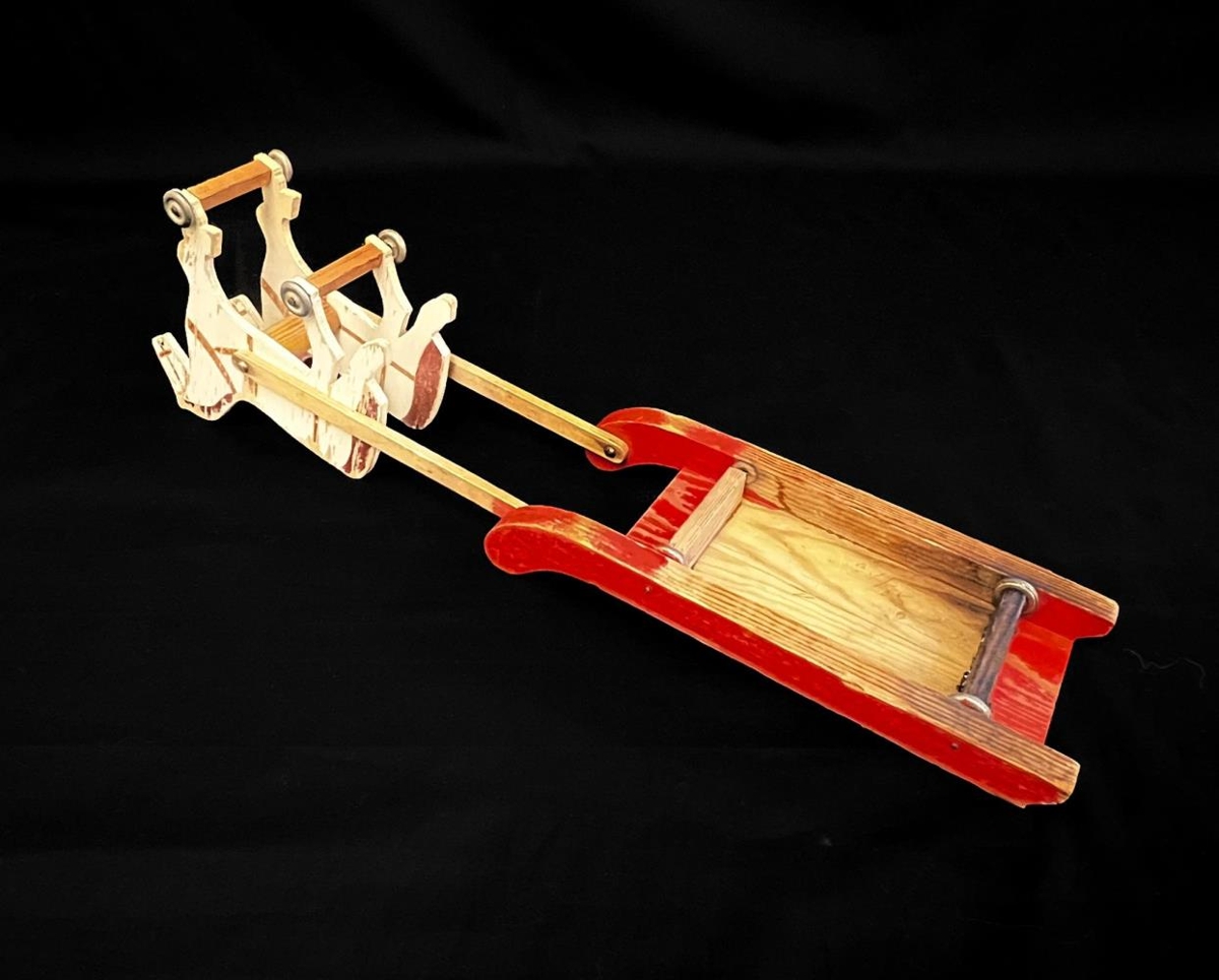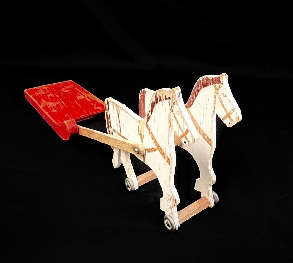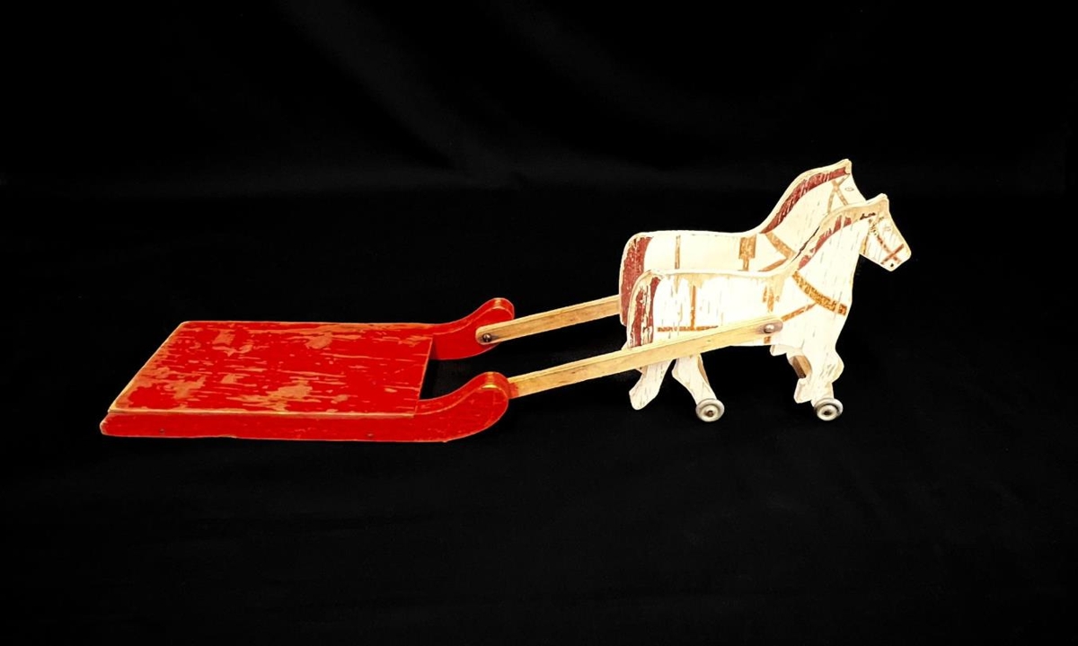 Hestar sem dragar kerru/sleða. Hestarnir og sleðinn eru á litlum hjólum. Hestar hvítir - festir saman með liltlum spýtum. Sleðinn aflangur og rauður. Guðmundur fékk leikfangið þegar hann var 2ja ára gamall. Hann var í sveit á Brúarlandi þar sem voru hestar sem unnu með svona vagna.