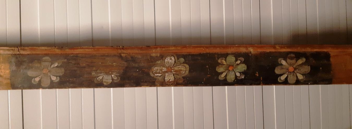 Hefur verið málaður bláum farfa en skreyttur fagurlega gerðum rósum á köflum